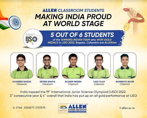 The students of ALLEN Career Institute Pvt. Ltd. have brought laurels to the country in the International Junior Science Olympiad (IJSO) 2022. ALLEN Classroom students have won 5 gold medals in IJSO. The Indian team have won 6 gold medals in IJSO Olympiad, out of which the students of ALLEN Career Institute won 5 Gold medals.