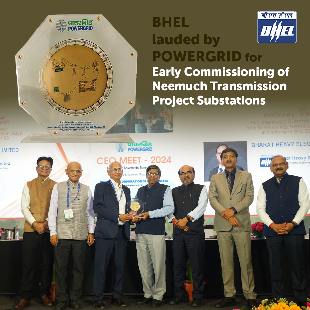 BHEL has been honoured by POWERGRID at the CEO Meet 2024 for its remarkable achievement in commissioning three critical substations under the Neemuch REZ TBCB project ahead of the contractual schedule, despite facing initial challenges.