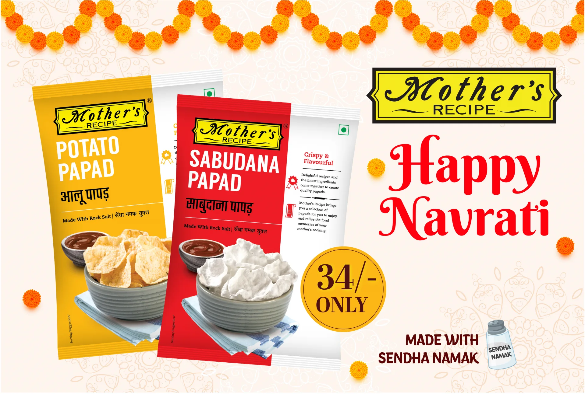 Since food plays an integral part in all celebrations Mother’s Recipe offers a variety of Indian culinary ranges for every season and festival. Mother’s Recipe’s current product portfolio consists of Pickles, Cooking Paste, Instant mixes, Indian Chutneys, Papads, Ready to cook, Ready to eat, and newly added Global Exotic Sauces. For this auspicious month of Navratri, Mother’s Recipe has a special offer on both Potato and Sabudana fasting papads which is available to the customers only via https://www.mothersrecipe.com/collections/papad/products/navratri-special-potato-sabudana-with-sendha-namak-for-fasting-pack-of-9-each