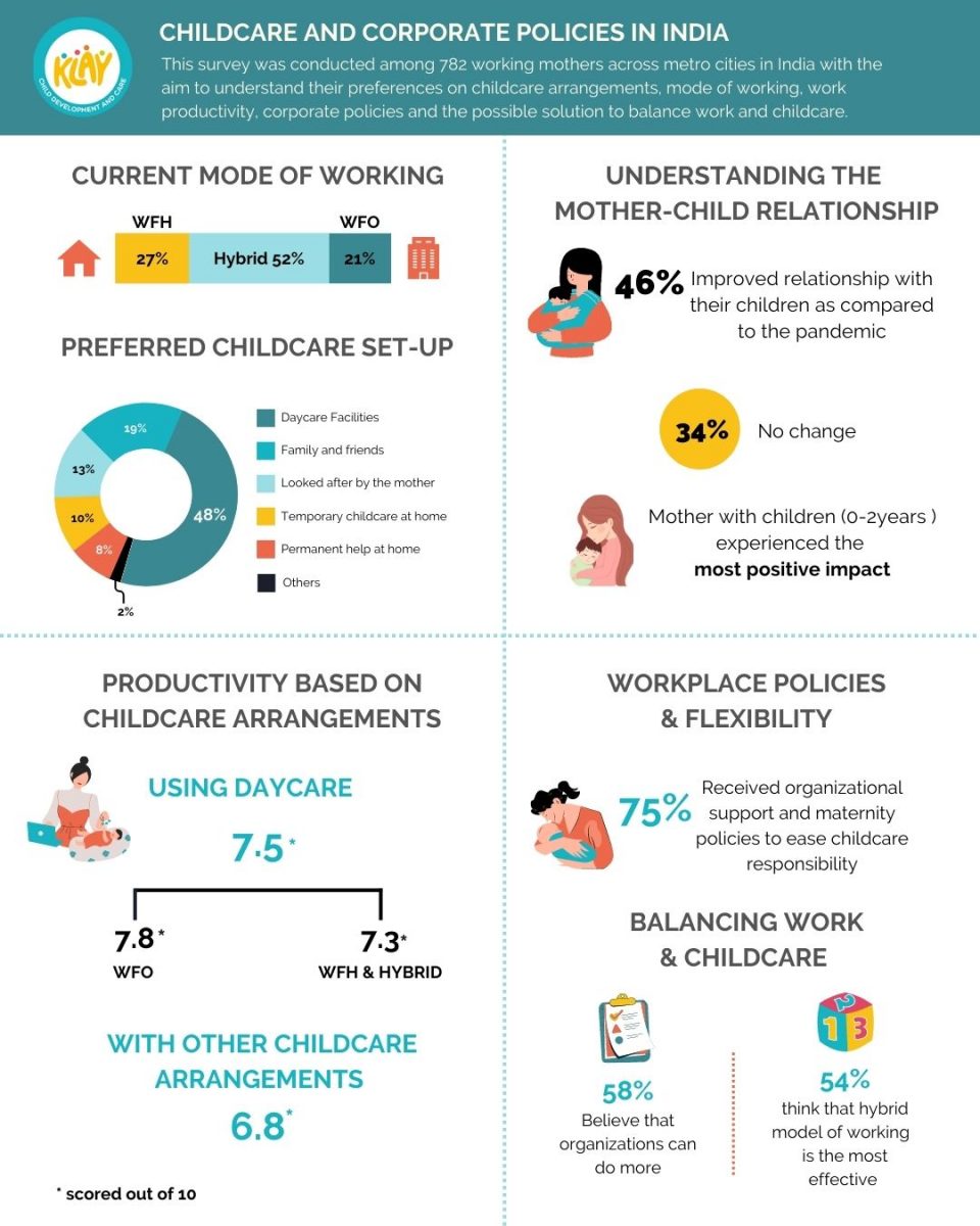 AK Srikanth, CEO, KLAY Centers for Child Development and Care, said, “Today, balancing work and caring for one’s child continues to be one of the biggest challenges faced by working mothers. This survey has reiterated our belief in the fact that the childcare infrastructure of a country wears many hats and serves the mother, the child, and the corporate! It has a huge role in alleviating maternal stress and guilt over leaving the child behind and going to work, it facilitates the child’s holistic development, helps organisations to provide meaningful support to their women employees and encourages greater workforce participation and retention. Further, childcare facilities can also impact the productivity of mothers while at work irrespective of whether she works from home or from the office“.