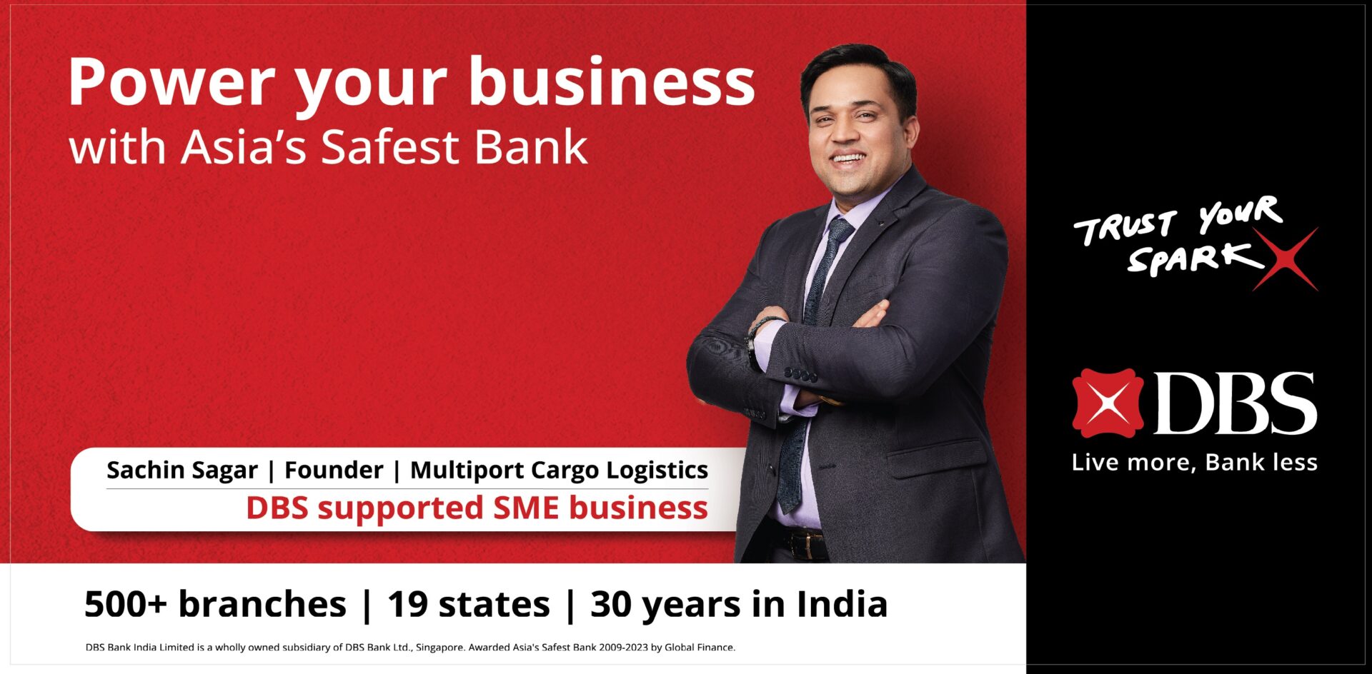 DBS has been accorded the “Safest Bank in Asia” award by Global Finance[i] for 15 consecutive years, from 2009 to 2023. It occupies a unique position in India, combining strong global expertise with a deep local understanding. The bank continues to leverage its extensive physical network and digital capabilities to provide solutions that meet the evolving needs of its customers, fostering trust and building lasting relationships.