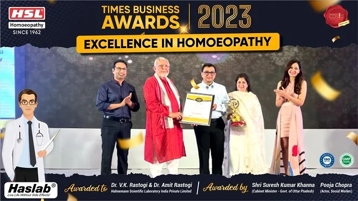 In a momentous and exclusive event, Hahnemann Scientific Laboratory India Private Limited (Haslab) has been bestowed with the highly prestigious Excellence in Homoeopathy Award at the esteemed Times Business Awards. This distinguished recognition, presented by the renowned Shri Suresh Kumar Khanna, Cabinet Minister of the Government of Uttar Pradesh, and the illustrious actor and devoted social worker, Pooja Chopra, celebrates Haslabs unwavering commitment to providing exceptional homoeopathic remedies and its profound mission of enabling individuals to live a life without any side effects.