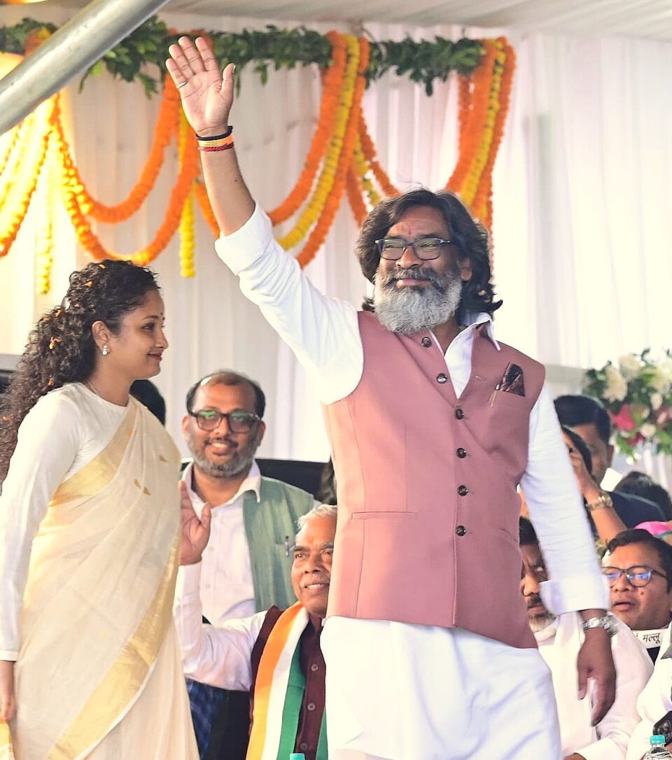 Jharkhand Governor Santosh Kumar Gangwar administered oath of secrecy to Jharkhand Mukti Morcha leader, Hemant Soren as the Chief Minister of Jharkhand for the 4th time in a grand ceremony attended by top leaders of the INDIA bloc at Morabadi ground in Ranchi, the state capital on November 28, 2024. Hemant was seen seated with his wife and MLA, Kalpana Soren, his parents, Shibu Soren, founder of JMM and former Chief Minister of Jharkhand and Roopi Soren during the ceremony.
