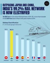 NEW DELHI. Indian Railways has achieved a major milestone by becoming the biggest electrified rail system globally, with nearly its entire 70,000 route-kilometre broad-gauge network now running on electric traction. By November last year, more than 99 per cent of the network had been electrified, reflecting a transformative shift toward cleaner, more efficient rail operations and significantly reducing dependence on fossil fuels.
