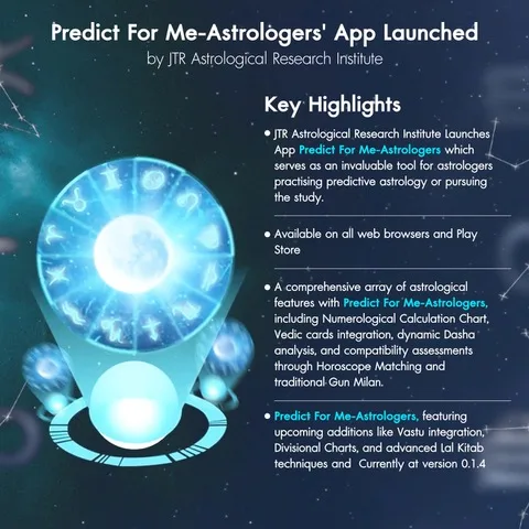 "JTR Astrological Research Institute Launches App 'Predict For Me-Astrologers': Bridging Traditional Astrology with Modern Technology"The app offers features like Numerological Calculation Chart, Vedic cards integration, Lagna Chart insights, Niryana Bhav Chalit for planetary positions, dynamic Dasha analysis, Life Events Combinations, Transit of Planets, Automated Transit Event Search, Time Tool for precise calculations, Horary Kundl for horary astrology, Longitude of Houses and Planets, Nakshatra and Sub Lord identification, and compatibility analysis through Horoscope Matching and traditional Gun Milan.