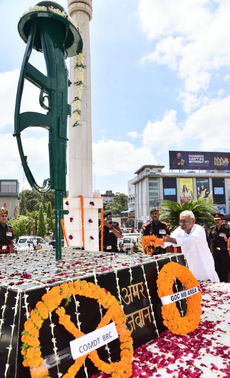पटना। कारगिल विजय दिवस पर बुधवार को गांधी मैदान के समीप आयोजित राजकीय समारोह में राज्यपाल राजेन्द्र विश्वनाथ आर्लेकर, मुख्यमंत्री नीतीश कुमार व उपमुख्यमंत्री तेजस्वी प्रसाद यादव ने शहीद-ए-कारगिल स्मृति स्थल पर कारगिल के अमर शहीदों को पुष्प चक्र अर्पित कर श्रद्धांजलि दी। इस अवसर पर बिहार रेजिमेंटल सेंटर (बीआरसी, दानापुर) के सशस्त्र जवानों ने कारगिल के अमर शहीदों को सलामी दी तथा सूचना एवं जनसंपर्क विभाग के कलाकारों ने बिहार गीत एवं देशभक्ति गीतों के कार्यक्रम प्रस्तुत किये।