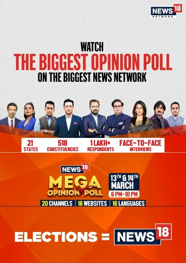 The results of the News18 Mega Opinion Poll will be covered extensively across all 20 News18 network channels including News18 India, CNN-News18 and News18 regional channels in 16 languages. The results will also feature on News18’s 16 websites in various languages, ensuring wide-reaching and inclusive coverage of the landmark survey.
