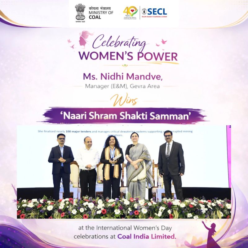 NEW DELHI. On the occasion of International Women’s Day, Coal India Limited hosted a ceremony in New Delhi to present the Naari Shram Shakti Samman to women who have made outstanding contributions to the mining sector. Among the awardees was Ms. Nidhi Mandve, Manager (E&M) at the Gevra Area of South Eastern Coalfields Limited (SECL). Serving at the Gevra mine, which is Asia’s second-largest coal mine, Ms. Mandve was recognized for her critical work in managing dewatering systems and overseeing nearly 100 major tenders, ensuring that large-scale coal production remains uninterrupted for India’s energy security.