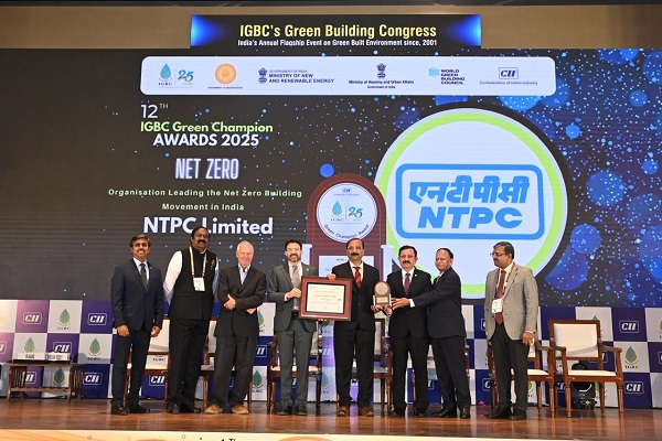 NTPC has been honored with the prestigious IGBC Green Champion Award in the category “Organisation Leading the Net Zero Building Movement in India” at the CII–IGBC Green Building Congress 2025. The award was received by Shri Tapan Kumar Bandyopadhyay, Executive Director (SSEA), NTPC, from Mr. B Thiagarajan, Chairman of IGBC, and Mr. Jeff Oatman, Chairman of the Asia Pacific Network at the World Green Building Council. This accolade highlights NTPC’s unwavering commitment to sustainability and its proactive efforts to set green, net-zero benchmarks across its facilities nationwide. The recognition underscores NTPC’s leadership in transforming infrastructure into models of energy efficiency and environmental responsibility, aligning with India’s national climate action and sustainable development goals. Notably, last year, NTPC achieved key milestones including Net Zero Water certification for Ratnagiri township and Net Zero Energy certifications for Kudgi township and the NETRA office, demonstrating its strategic focus on integrating sustainable practices. With plans to expand its net-zero footprint through additional townships and offices, NTPC continues to reinforce its position as a trailblazer in green energy and sustainable infrastructure, contributing significantly to India’s vision of a resilient, eco-friendly, and energy-efficient future.