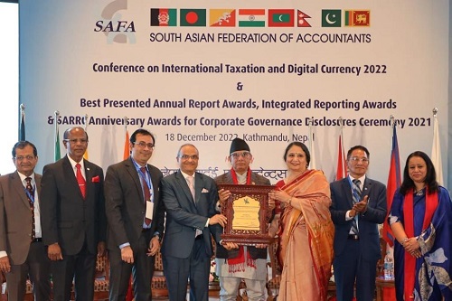 Smt Parminder Chopra, Director (Finance), Shri. R K Malhotra, ED (Finance) and Shri. Mohd. Salim, GM (Finance), PFC received this prestigious award at the award distribution ceremony held on 18th December 2022 in Kathmandu, Nepal.