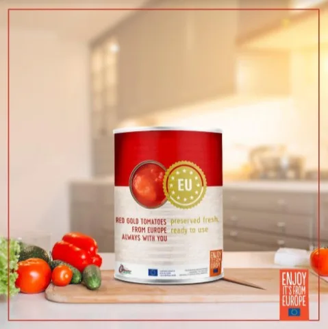 Red Gold Tomatoes from Europe is the name of the EU (European Union) project to raise awareness of EU-preserved canned tomatoes, 100% made in Europe. Canned tomatoes are produced using a traditional process that preserves all flavour of the fruit, harvested at the peak of its ripeness and flavour which has been perfected over time. Red Gold Tomatoes from Europe come in various forms – whole peeled, cherry, or dice, bringing the finest quality of European produce to our kitchen.
