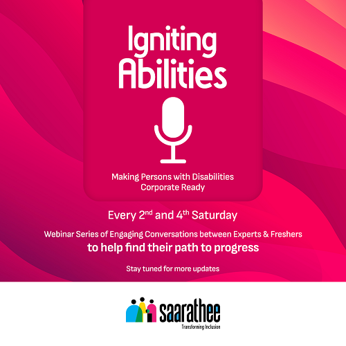 Saarathee, a visionary company that aims to deliver business & social impact by operationalizing inclusion of persons with disabilities within the corporate workforce, is excited to introduce their new endeavour ‘Igniting Abilities‘- an exclusive webinar series that engages dialogue with Persons with Disabilities (PwDs) on corporate opportunities by bringing experts and freshers together on one platform.