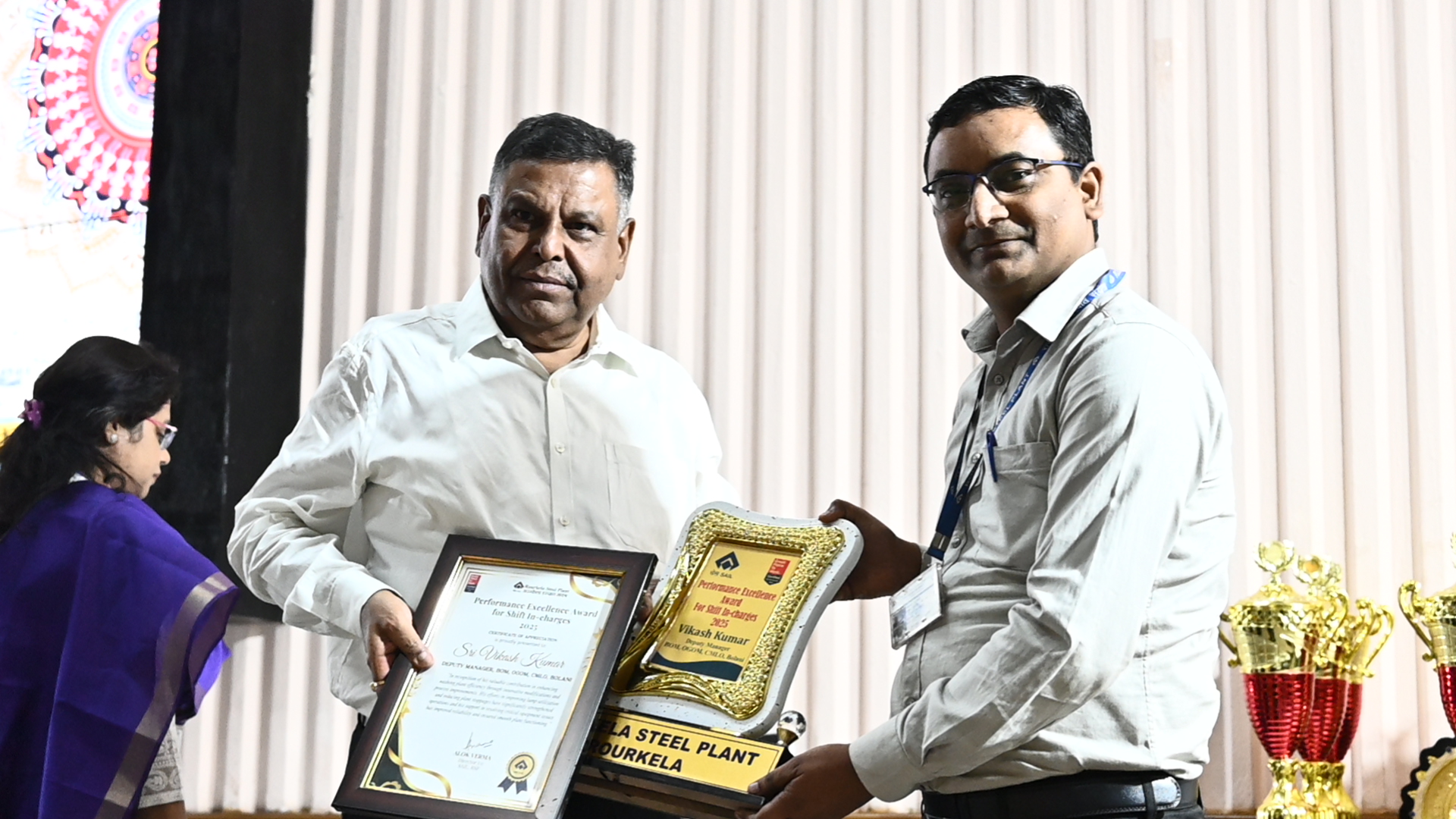 This year the award received by Mr. Shanu Sinha, Deputy Manager, Sintering Plant-III, Mr. Managobinda Parida, AGM, Blast Furnaces, Mr. Udaya Narayan Shial, AGM, Steel Melting Shop-I, Mr. Simanchal Gouda, Senior Manager, New Plate Mill, Mr. Umakanta Rout, Asst Manager, Town Engineering, Mr. Vikash Kumar, Deputy Manager, BOM, OGOM, CMLO, Bolani and Mr. Kalandi Charan Behera, Junior Engineer, Cent. Mech. Maint.