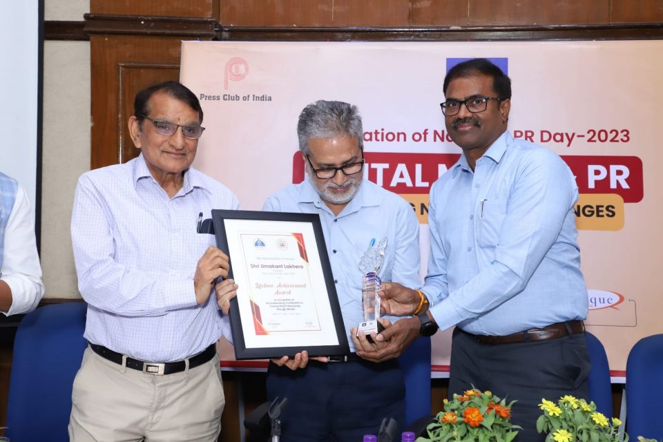 On the occasion of National PR day Public Relations Society of Delhi and Public Sector PR Forum has honoured Shri Uma Kanth Lakhera, President, Press Club of India, with the Lifetime Achievement Award for his outstanding contribution in strengthening Professional connect with Media and Corporate Communication / PR professionals to Corporate Communication in presence of Media and Advertising personalities and CC Professional in large number. Shri P D Hindwan, President, PSPRF, Shri S S Rao, Chairman, PR Society, Delhi presented the award to Shri Lakhera. Shri Uma Kant Lakhera is an eminent Media personality in Delhi.