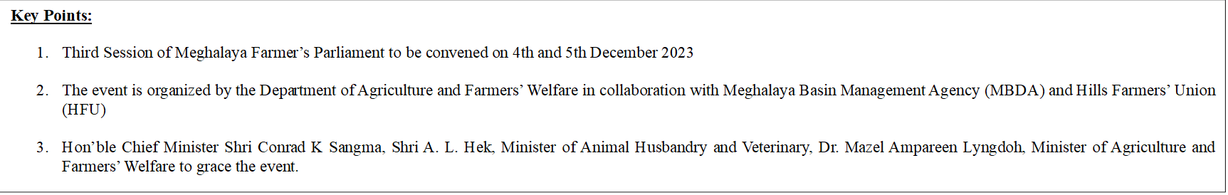 National, December 4, 2023 – The Meghalaya Farmers’ Parliament is set to convene its third session on the 4th and 5th of December 2023, coinciding with the celebration of Meghalaya Farmers’ Day at the prestigious State Convention Centre in Shillong. Organized by the Department of Agriculture and Farmers’ Welfare in collaboration with Meghalaya Basin Management Agency (MBDA) and Hills Farmers’ Union (HFU), this annual event has evolved into a pivotal celebration, acknowledging the relentless efforts and invaluable contributions of local farmers to the agricultural landscape.