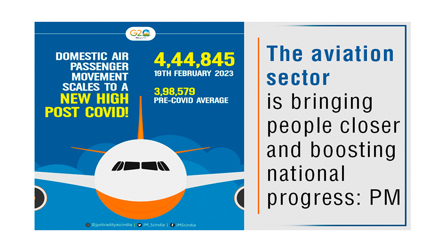 The Prime Minister, Shri Narendra Modi has lauded the increase in number of airports as domestic air passenger movement touches 4.45 lakhs, a new high post covid.Quoting a tweet by Union Minister for Civil Aviation, Shri Jyotiraditya Scindia, the Prime Minister tweeted;