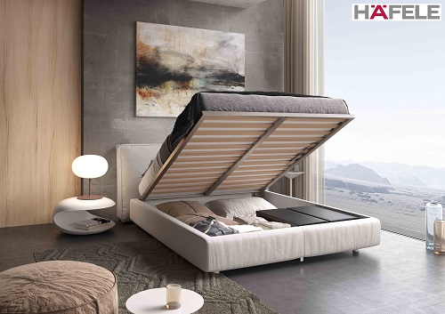 We often turn the storage space under our mattress into an extended wardrobe to stack our bags, books, traditional wear etc., doing so, however, without manually lifting the weight of the heavy mattress is a game changer. Hafele brings to you a new-age storage bed fitting – Gravity, which with its sleek build ensures not only optimal utilization of space available but also provides uninterrupted access to the storage space. With this bed fitting, you can enjoy hands-free opening, all you need to do is kick the pedal below the footboard and the mattress lifts itself up automatically.