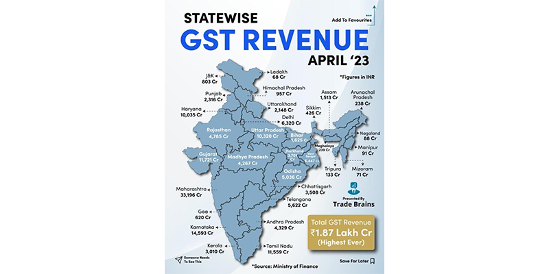 The State of Uttar Pradesh in April 2023 has joined the league of States that have GST Collection of Rs 10,000 Cr+ in one month. This is also the highest ever monthly collection in the GST regime Onwards to a Trillion Dollar economy for Uttar Pradesh.