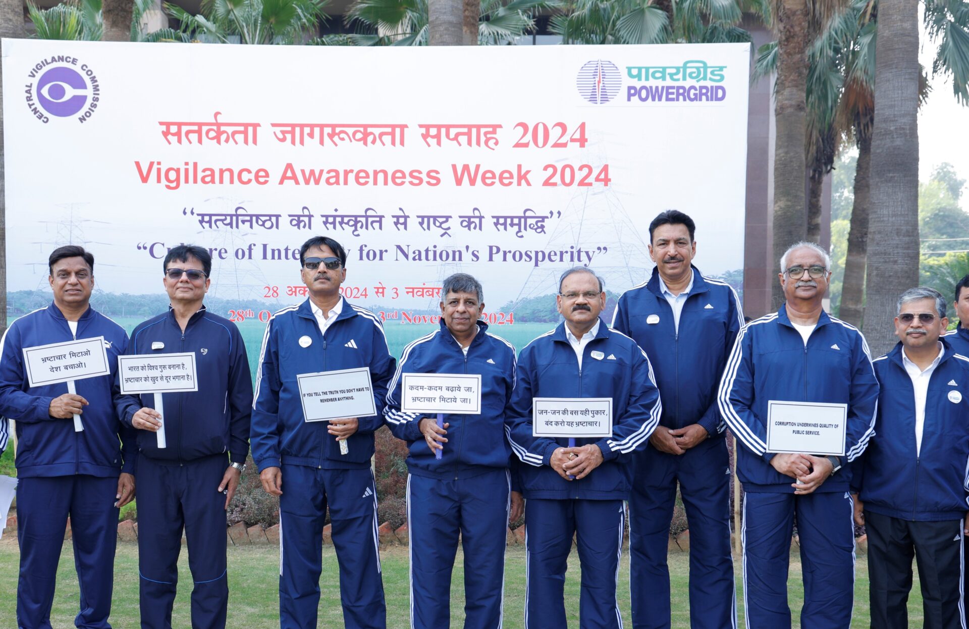 Power Grid Corporation of India Limited (POWERGRID) inaugurated Vigilance Awareness Week (VAW) 2024 with a spirited walkathon led by Shri R. K. Tyagi, CMD, alongside senior officials including Shri G. Ravisankar, Director (Finance), Dr. Yatindra Dwivedi, Director (Personnel), and Shri D. K. Madan, CVO. Employees from the Corporate Centre in Gurugram participated enthusiastically in this event. During the launch, an integrity pledge was administered to employees and senior officials, and messages from the Hon’ble President of India, Vice President, Prime Minister, Union Minister of Power, and Central Vigilance Commissioner were shared. This year’s Vigilance Awareness Week, running from October 28 to November 3, is centered around the theme “Culture of Integrity for Nation’s Prosperity”. A range of activities is being held across POWERGRID’s establishments nationwide, including drawing, painting, essay, and debate competitions hosted at Govt. School, Ulhawas, and Gurugram University. As of October 15, 2024, POWERGRID and its subsidiaries boast a robust transmission infrastructure, comprising 178,975 circuit kilometers of transmission lines, 280 substations, and a transformation capacity of 540,961 MVA, with an impressive system availability of 99.81%.