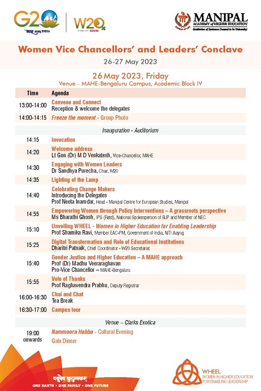 On 26th May at MAHE campus, Bengaluru, Lt. Gen. Dr. M D Venkatesh, Vice Chancellor, MAHE will commence the Conclave by delivering the welcome address along with Dr. Sandya Purecha, Chairperson of W20. Rest of the day will be packed with interesting sessions talking about ‘Empowering Women Through Policy Interventions’by Ms. Bharati Ghosh, IPS (Rtd.), member of NEC; ‘Unveiling WHEEL- Women in Higher Education for Enabling Leadership’ by Dr. Shamika Ravi, Member EAC-PM, Government of India, NITI Ayog; ‘Digital Transformation and Role of Educational Institutions’by Dharitri Patnaik, Chief Coordinator – W20 Secretariat; and ‘Gender justice and Higher Education – A MAHE Approach’by Prof Dr Madhu Veeraraghavan, Pro Vice Chancellor – MAHE Bengaluru.